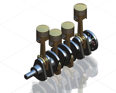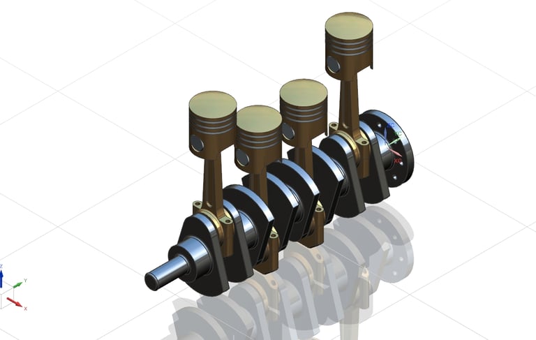 Eine vollständige CAD-Konstruktion eines Vier-Zylinder-Motors. Das Design umfasst alle wesentlichen Komponenten, darunter Kolben, Pleuelstangen, Kurbelwelle und die grundlegende Anordnung der Bauteile.