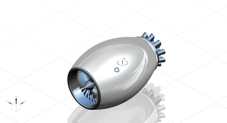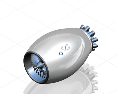 Ein detailliertes Design eines Flugtriebwerks, das alle wesentlichen Bestandteile umfasst. Es beinhaltet die äußere Struktur sowie die internen Komponenten, einschließlich der Turbinenschaufeln und der Düse. Ziel ist es, die Aerodynamik, Effizienz und Funktionsweise eines modernen Strahltriebwerks auf anschauliche Weise darzustellen.