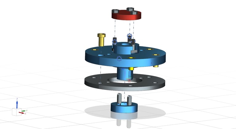Explosionsdarstellung eines Ventils, das präzise konstruiert wurde, um die einzelnen Komponenten und deren Montage deutlich darzustellen. Die Darstellung erleichtert das Verständnis der Funktionsweise und des Aufbaus der Baugruppe.