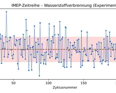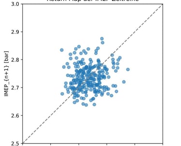 Simulationsergebnisse als Diagramm: Beispielsweise ein Plot, der simulierte und experimentell gemessene Zylinderdruckkurven über dem Kurbelwinkel vergleicht, um die Übereinstimmung des Modells mit realen Daten zu demonstrieren. Auch Darstellungen zur zyklischen Variabilität (IMEP-Streuungen, Return-Maps) eignen sich, um die statistische Auswertung zu illustrieren.